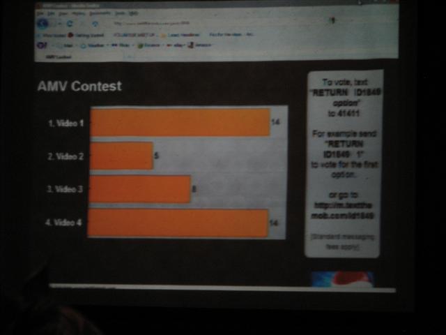 The voting system at first was very basic, raise your hand for your favorite video, out of three presented to you choose one. Then those top videos with the most votes moved to the finals where a cell phone vote was used. This was a really cool system, but I’m not sure it will work with a multi category audience vote if that is ever needed. Still a very cool system and I like the idea.